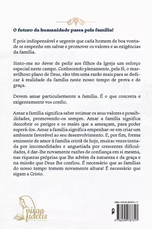 Sinto-me no dever de pedir aos filhos da Igreja um esforço especial neste campo. Conhecendo plenamente, pela fé, o maravilhoso plano de Deus, eles têm uma razão mais para se dedicar à realidade da família neste nosso tempo de prova e de graça.